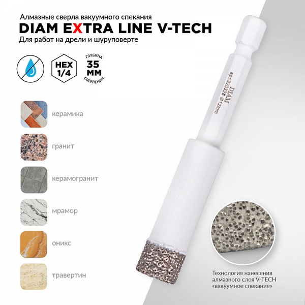 Алмазное сверло вакуумного спекания Diam Extra Line V-Tech HEX-E 1/4" 12 мм (Диам Экстра Лайн В-Теч Хекс-Е 1/4" 12 мм) предназначено для сверления отверстий Ø 12 мм, глубиной до 35 мм в керамике, граните, керамограните, мраморе, ониксе, травертине без водяного охлаждения при помощи шуруповерта или дрели.