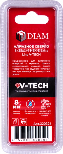 Алмазное сверло вакуумного спекания Diam Extra Line V-Tech HEX-E 1/4" 8 мм (Диам Экстра Лайн В-Теч Хекс-Е 1/4" 8 мм) предназначено для сверления отверстий Ø 8 мм, глубиной до 35 мм в керамике, граните, керамограните, мраморе, ониксе, травертине без водяного охлаждения при помощи шуруповерта или дрели.