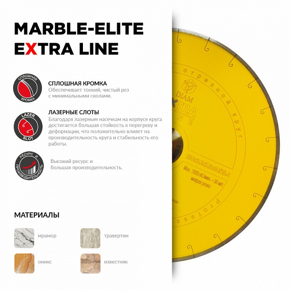 Алмазный отрезной круг Diam Extra Line 1A1R Корона Marble-Elite 400 мм (Диам Экстра Лайн 1А1Р Корона Марбл-Элит 400 мм) – профессиональный алмазный диск специального назначения для высокопроизводительной мокрой резки мрамора, оникса, травертина, известняка на бензорезах, электрических резчиках, 4настольных камнерезных станках, стенорезных машинах, швонарезчиках и промышленном оборудовании с подачей воды.