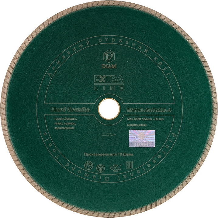 Алмазный отрезной круг Diam Extra Line Turbo Hard Granite 250 мм (Диам Экстра Лайн Турбо Хард Гранит 250 мм) – специальный, профессиональный, тонкий (всего 1,6 мм) алмазный диск с турбированной режущей кромкой тип Turbo для производительной мокрой резки твердой керамики, гранита, керамогранита, базальта, кварца, мрамора, гранитной и мраморной плитки, кирпича на электрических плиткорезах, камнерезных станках, бензорезах, электрических резчиках, стенорезных машинах с подачей воды.