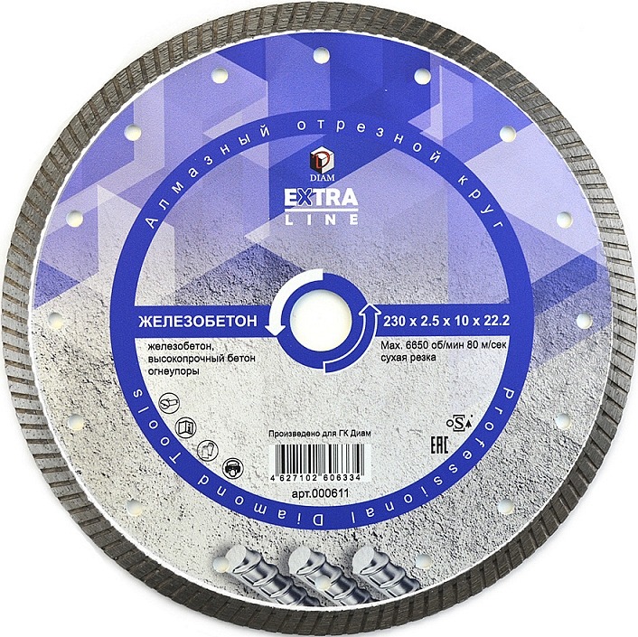 Алмазный отрезной круг Diam Extra Line Turbo Железобетон 230 мм (Диам Экстра Лайн Турбо Железобетон 230 мм) – профессиональный алмазный диск тип Turbo для сухой резки высокоармированного бетона (железобетона), высокопрочного тяжелого мелкозернистого бетона, кирпича, клинкера и других огнеупоров.