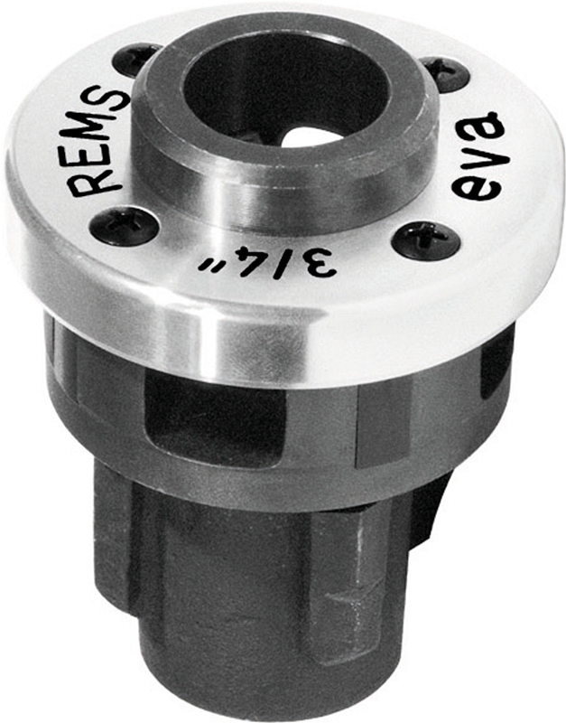 Быстросменная резьбонарезная головка Rems Eva S R 3/4" (Ремс Ева С Р 3/4") предназначена для нарезания правой трубной конической резьбы R (ISO 7-1, EN 10226 (DIN 2999, BSPT)) на стальных трубах Ø 3/4" в труднодоступных местах, например, в углублениях стен, на выпусках труб, в шахтах, с применением храпового рычага Ева 1/8"-2". Идеальна для ремонта, реставрационных работ.