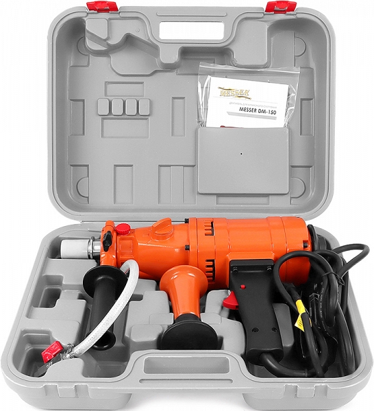 Дрель для алмазного бурения Messer DM-150 (Мессер ДМ-150) предназначена для алмазного сверления железобетона, бетона, кирпича и камня Ø отверстий до 150 мм, с подачей воды, как с использованием стойки, так и для работы с рук.