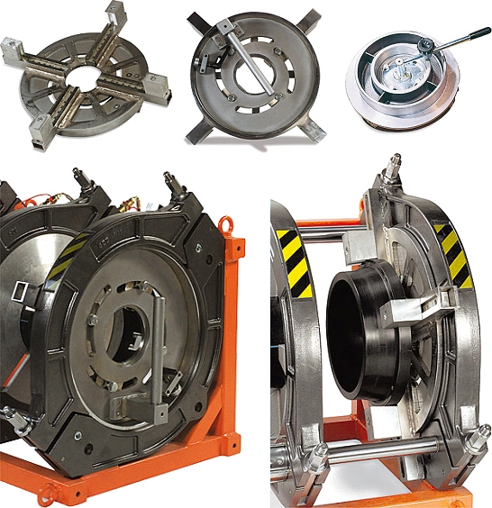 - Возможно приваривать фитинги (тройники, Y-образные, крестовины, отводы) без дополнительного оборудования, благодаря подвижным 1-му и 2-му зажимам, жесткому креплению 3-го зажима ко 2-му, фиксации фитинга в 4-ом зажиме, а также фланцы с помощью специального зажима (дополнительная опция)
