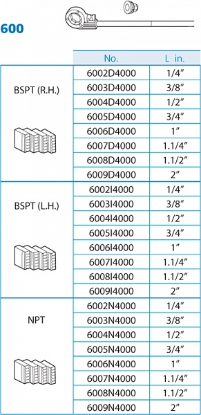 | 600000000 | Резьбонарезная трещотка | 1/4" – 1 1/4" | BSPT, NPT | R / L (Правая / Левая) |