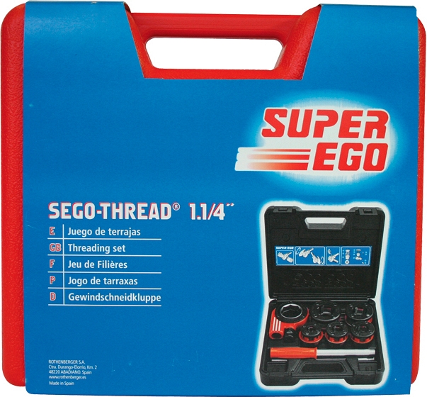 Клупп трубный ручной Super-Ego 600 Set Compact 1/2"-3/4"-1" BSPT R (Супер-Эго 600 Сет Компакт 1/2"-3/4"-1" БСПТ Р) предназначен для нарезки правой конической резьбы BSPT R на стальных трубах Ø 1/2", 3/4", 1" на стройплощадке при монтаже систем газо- и водоснабжения, отопления, в котлостроении и производстве.