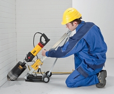 Компактный ручной привод для безвибрационного кольцевого сверления с посадочным местом под коронку UNC 1 1/4" наружный, G 1/2" внутренний. Прочный, удобный для использования на стройках. Всего 6,4 кг. Простая быстрая работа, высверливает отверстие 200 мм длиной и 62 мм диаметром всего за 3 мин. Практичный ручной держатель и стабилизатор для ручного сверления. Специальная стойка для высверливания отверстий свыше 60 мм. Система подвода воды для мокрого бурения, с регулируемым запорным клапаном, быстродействующей муфтой с водостопом и соединением под шланг 1/2". Специальный ротор для отсасывания пыли с разъемом для подключения к пылесосу, как аксессуар. - Привод: