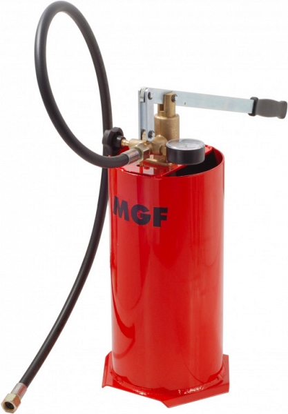 Опрессовщик ручной вертикальный MGF 60 бар (МГФ 60 бар) – ручной испытательный опрессовочный насос с вертикальным резервуаром и манометром для опрессовки и проверки герметичности контуров и сосудов под давлением, испытаний на утечку в водопроводах и резервуарах с давлением до 60 бар.