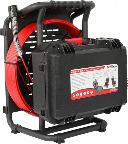 - Головка камеры Ø 21 × 45 мм и проталкиваемый кабель Ø 5,3 мм × 40 м из стекловолокна со счетчиком длины, подходящие для труб Ø 50 – 125 мм, длиной до 40 м