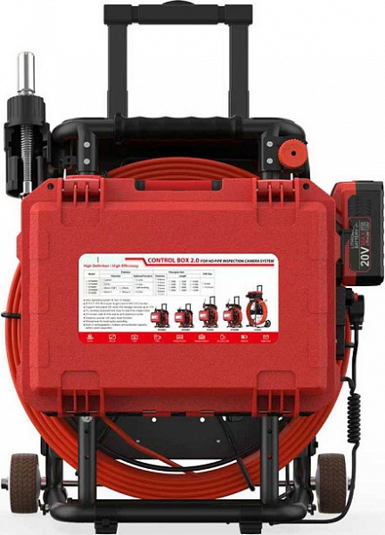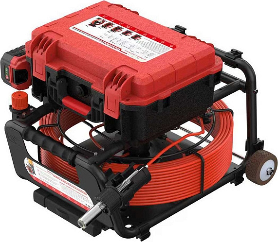 - Головка камеры Ø 21 × 45 мм и проталкиваемый кабель Ø 5,3 мм × 40 м из стекловолокна со счетчиком длины и системой торможения, подходящие для труб Ø 50 – 125 мм, длиной до 40 м