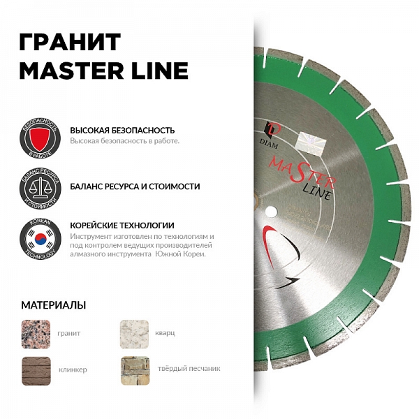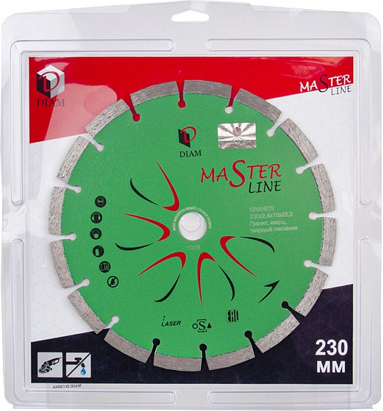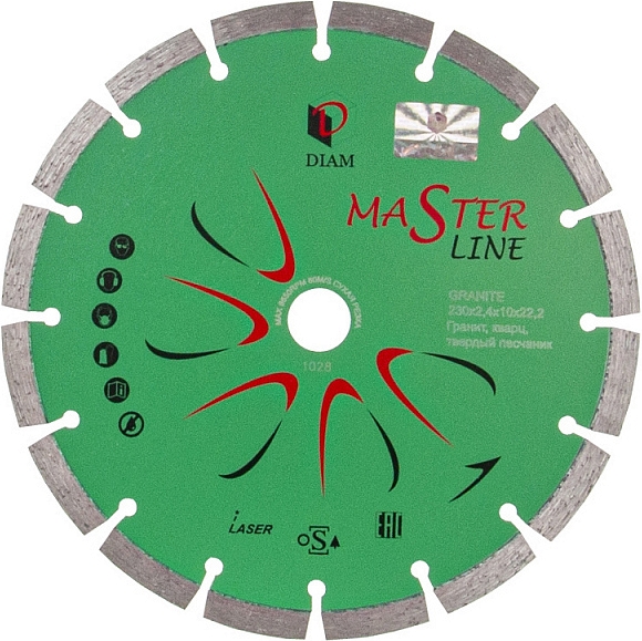 Сегментный алмазный круг Diam Master Line 1A1RSS Гранит 230 мм (Диам Мастер Лайн 1А1РСС Гранит 230 мм) – специальный сегментный алмазный отрезной диск для сухой и мокрой резки гранита, кварца, клинкера, твердых песчаников на углошлифовальных машинах (ушм, болгарках), штроборезах, бензорезах, электрических резчиках и плиткорезах, системах резки крупноформатной плитки, ручных стенорезных машинах и другом оборудовании, как с подачей, так и без подачи охлаждающей жидкости.