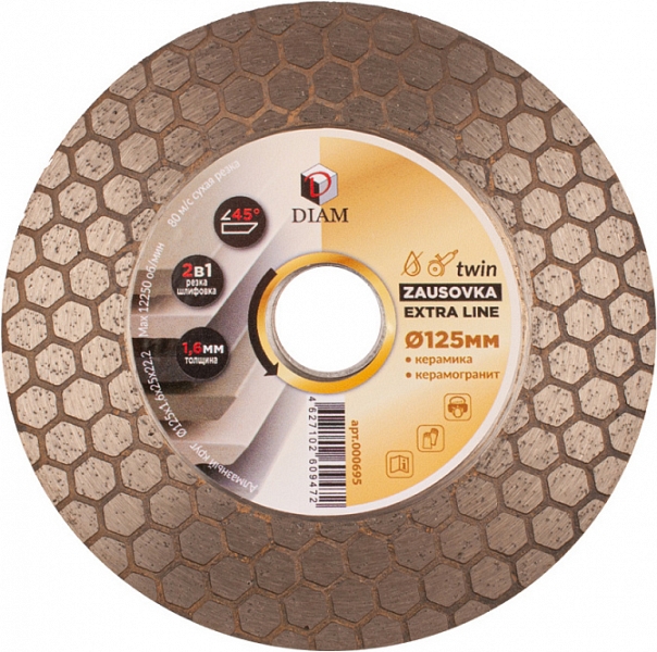 Специальный алмазный круг Diam Extra Line Turbo Zausovka Twin 125 мм (Диам Экстра Лайн Турбо Заусовка Твин 125 мм) – специальный тонкий 1,6 мм алмазный отрезной диск для резки и заусовки (шлифовки) керамической плитки и керамогранита.