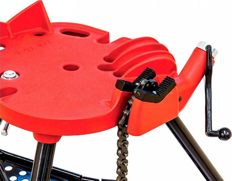 - Большой корпус интегрированных цепных тисков позволяет надежно фиксировать трубы или арматуру