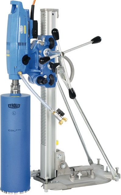 Установка алмазного бурения Tyrolit Hydrostress DRA 250 / DRU 250 (Тиролит Гидростресс ДРА 250 / ДРУ 250) – система алмазного сверления сквозных и глухих отверстий Ø 40 – 250 мм в железобетоне, кирпичной и каменной кладке и других минеральных материалов без вибрации, сильного шума и пыли, под углом 90° – 45°. Предназначена для бурения отверстий малых диаметров под анкерные крепления (механические и химические анкера), под трубы отопления, под электропроводку; отверстий средних диаметров под трубы отопления и канализации, под системы коммуникаций, для взятия проб, под системы кондиционирования, серийные отверстия (под проемы), угловые отверстия для работы со стенорезными машинами; отверстий больших диаметров под трубы больших диаметров, под прокладку кабелей, кабельных лотков, в фундаментах (усиления), под вентиляцию.